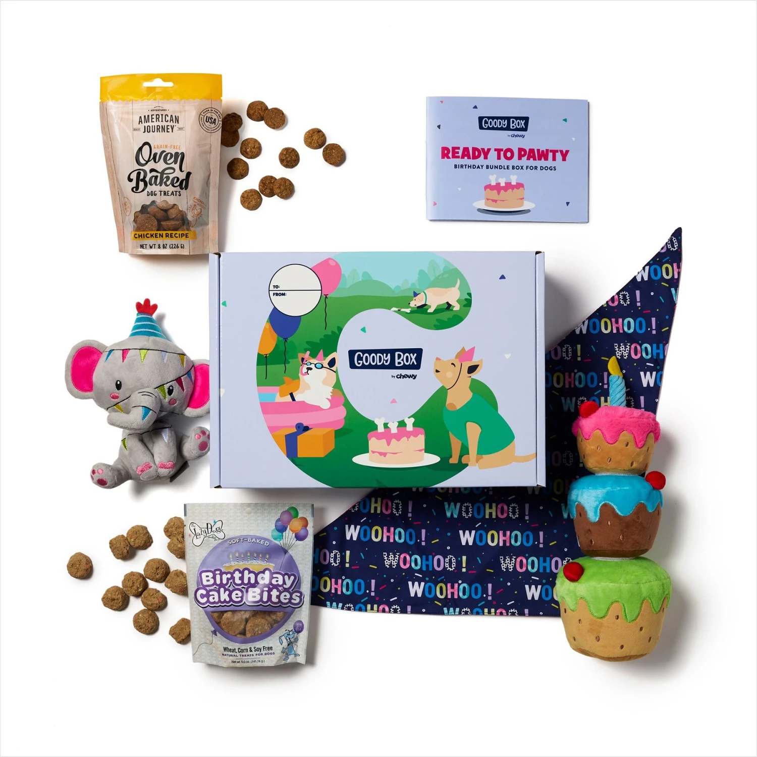 - Fun toys, tasty treats and a super-stylish hat? What more can you ask for? This limited-edition, BDay themed Goody Box comes with six items that’ll give your dog plenty of ways to enjoy the love on their special day.
