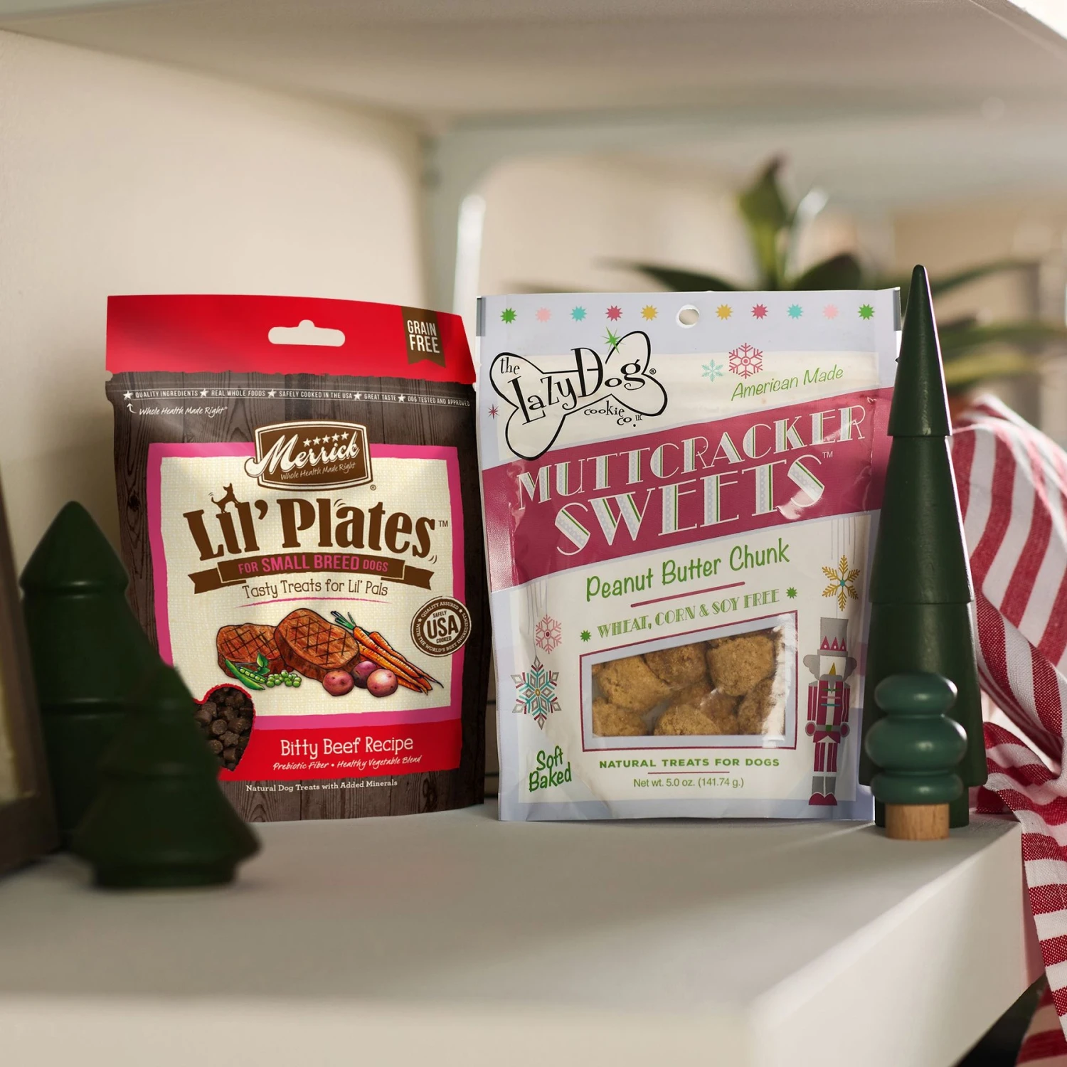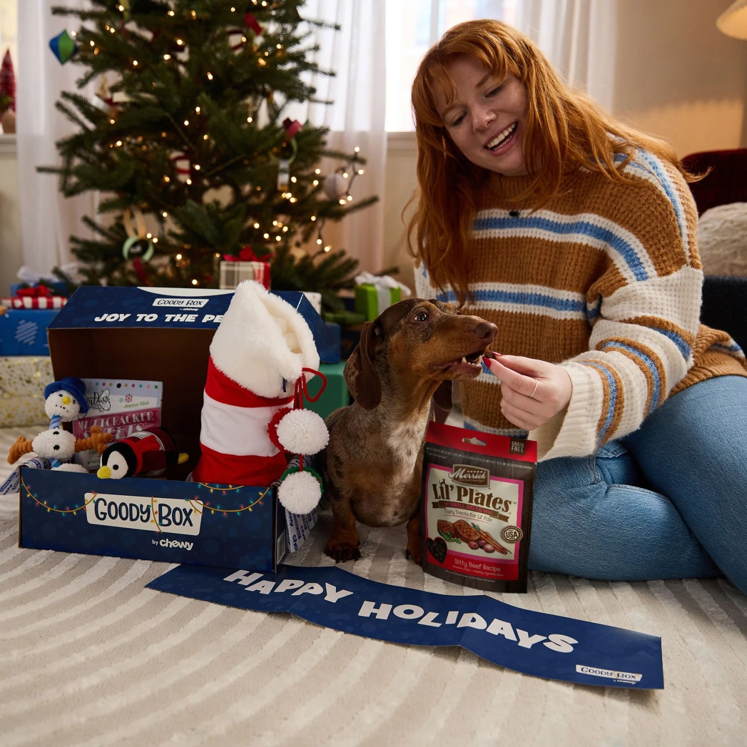 - This holiday Goody Box includes a penguin plush squeaky toy, a snowman plush squeaker with rope, delectable treats from Zuke’s and Lazy Dog, as well as a striped stocking with pom-pom and a loop to hang it up.