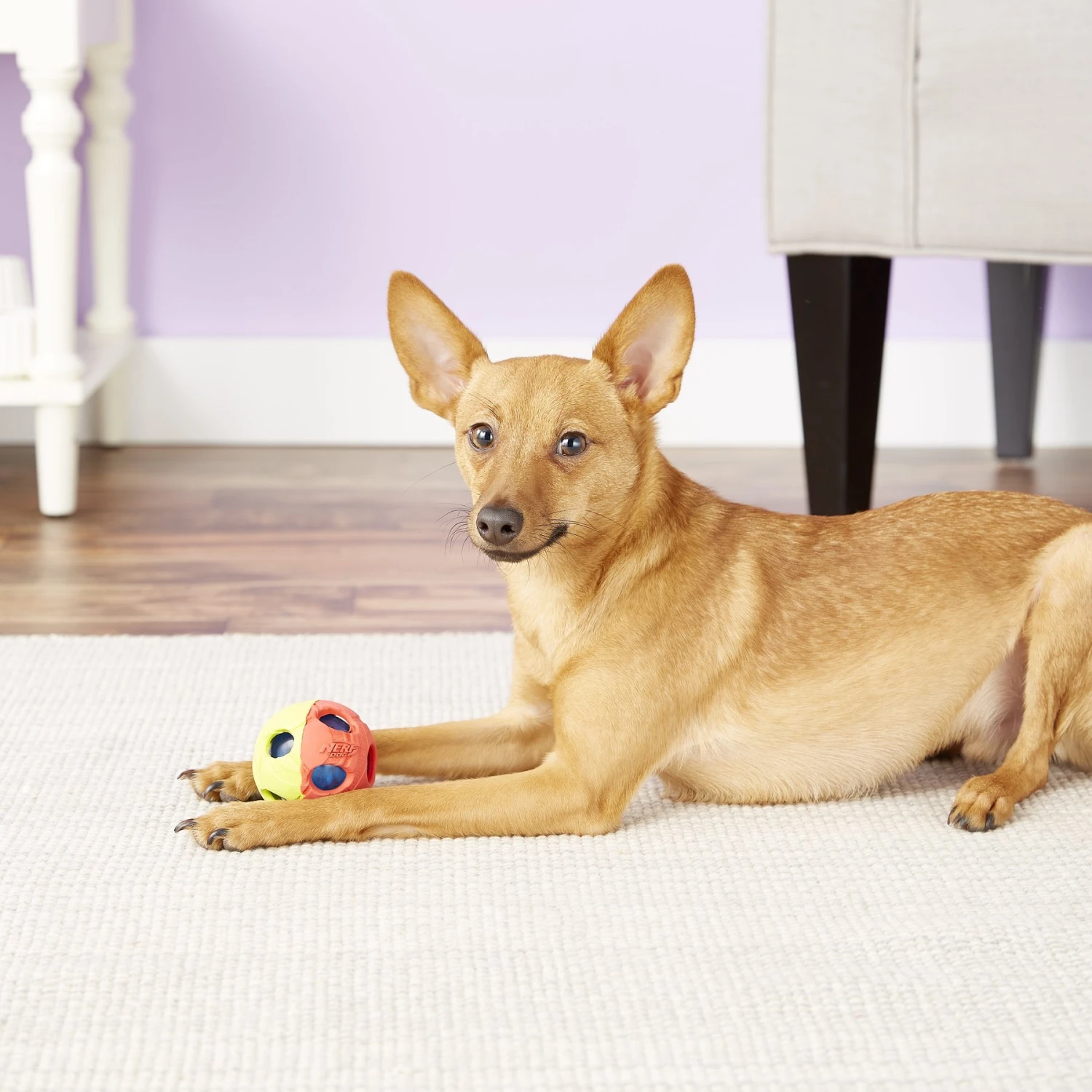 - Provides hours of bouncing play for small size dogs with flashing LED light inside.
