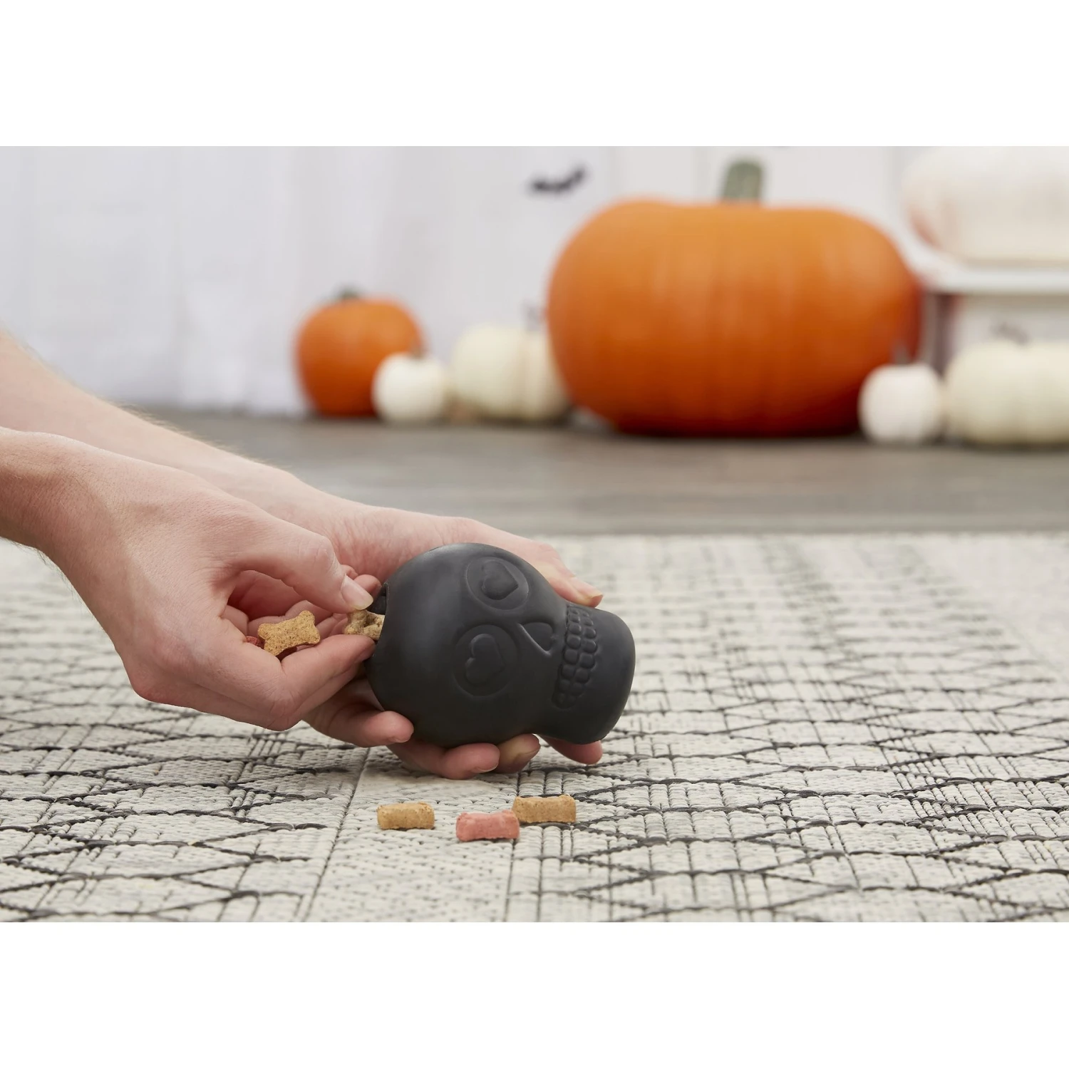 - Skull shaped toy that dispenses treats for the howl-iday season or kibble as a slow feeder.